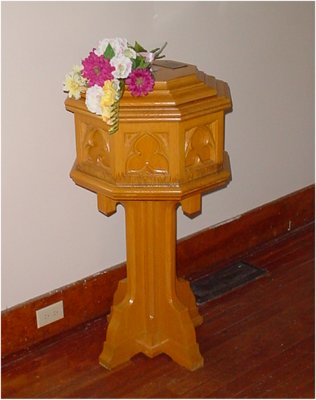 Copper Offering plate and flower Boxes ( in front of the Church) -- are originals and were made by a former Bralorne Mine Employee. They were returned to the Church before the official Re-Opening of the Church in 2001.Altar Cross was made and donated to our Church, by a member of the St. Thomas' Anglican Church Chilliwack B.C. and brought to the Church by Marilyn Fane and Joan Sutcliffe of Gun Lake and Chilliwack B.C.Brass Candle Sticks were donated by the Deer Lake United Church, Burnaby B.C. with the help of Rev. P. Collins Donated in 2001Original Bible -- dated 1936 (given to the Boultbee Memorial Church in June 1936, on the occasion of the Dedication of the new Church) The Bible was returned to the Church this past year by the Bralorne Pioneer Museum Committee. The Bible was restored in 2004 and it now is back on the Church altar, after so many years.Original Baptismal Font -- was returned to the Church in 2003, with the kindness of the Congregation of the United Church of Texada Island and Rev. Jim Erb. The Babtismal Font was made by a member of the Boultbee Memorial Church. The Congregation presented it to the Church and the parents, in Memory of Jo-anne Margaret (1955-1959), daughter of Mr. and Mrs, George Thomson.