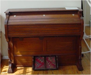 Altar China Cabinet -- was generously donated by J.W. Pepin Lillooet B.C. It contains pieces that were returned and were donated to the Church. The Communion Pieces and the wooden offering Plate and silver Baptismal Font were donated by the Deer Lake United Church Burnaby B.C. Silver flower Container, and CGIT goblets (dated 1938 and 1946) were returned to the Church in 2001 by the Congregation of the Lillooet United Church. (They were in Lillooet since the Church was closed in the 1970's)Organ (which is in the front of the Church) -- was donated by Mr. and Mrs, L. Lange Courtney B.C.